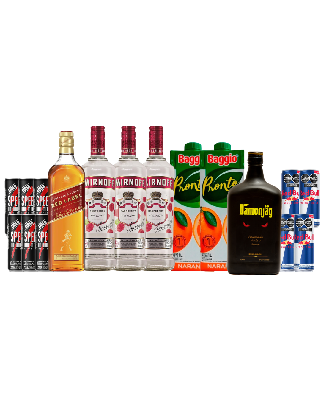 Incluye: 1 J.W Red Label 1 lt + 3 Smirnoff saborizados + 1 Damonjag 1 lt + 6 Red Bull + 10 Speed + 2 Jugos